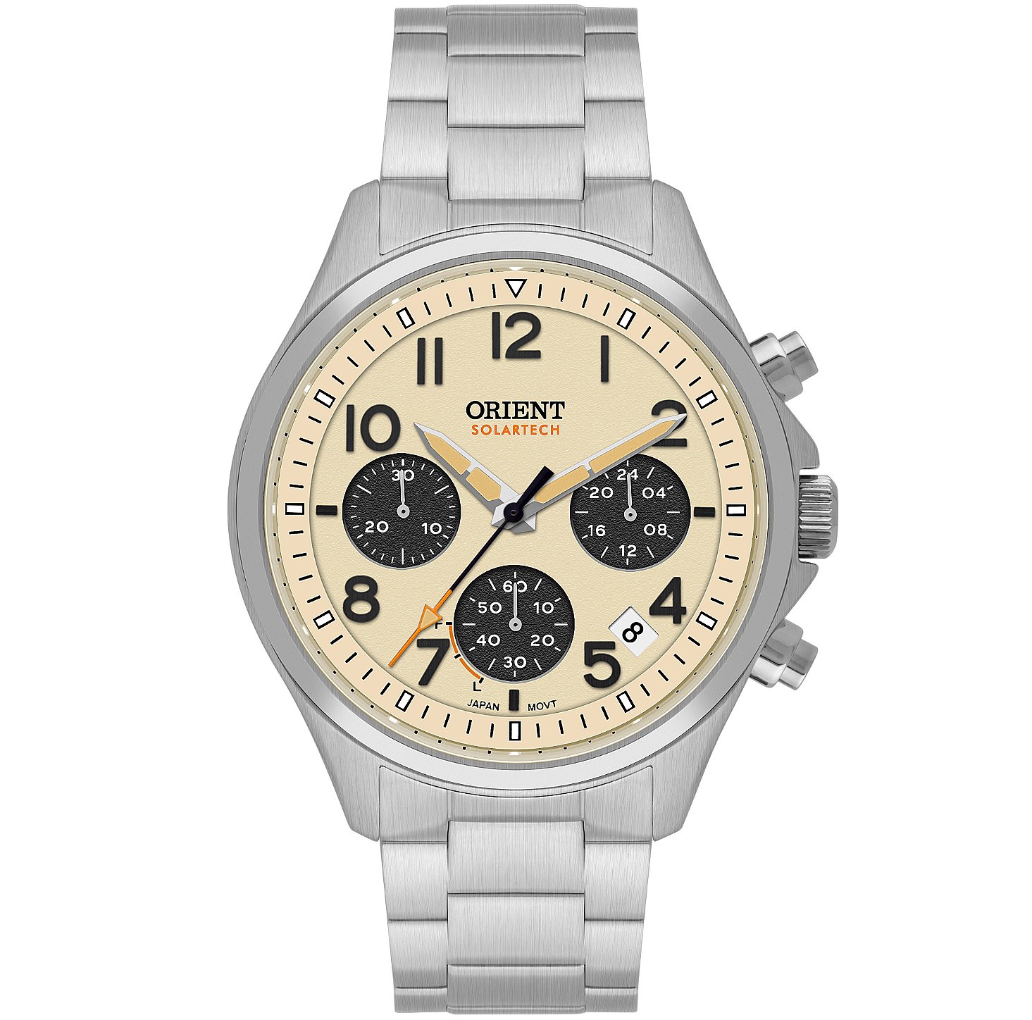 Seu mostrador em tom areia texturizado, aliado aos submostradores contrastantes e numerais bem definidos, reforça o caráter técnico do relógio, enquanto a caixa em aço com acabamento escovado entrega presença no pulso com equilíbrio e sofisticação.