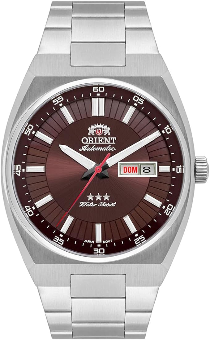Equipado com o prestigiado calibre automático Seiko NH36, o modelo oferece enrolamento manual, função hacking (parada do ponteiro de segundos) e calendário duplo (dia e data) com idiomas em inglês e espanhol. Um relógio que combina a precisão mecânica da Orient com a elegância que atravessa gerações.