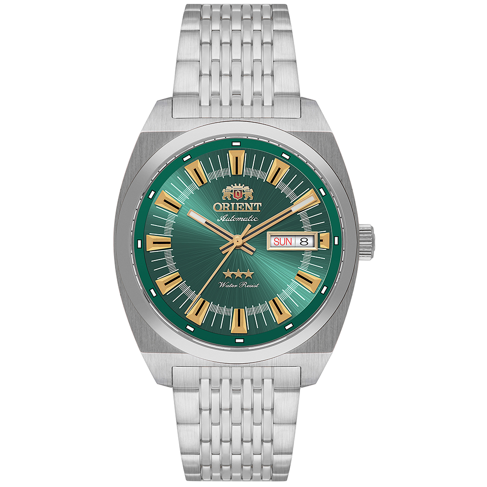 O Orient Heritage 3 Estrelas YN6SS014 E1SX celebra o legado da relojoaria japonesa com um design que atravessa gerações. Seu mostrador verde texturizado em estilo persiana, combinado aos índices e ponteiros dourados, remete aos modelos clássicos da década de 1970 — época em que a linha 3 Estrelas conquistou seu status de ícone mundial. O brasão dourado da Orient e o símbolo das três estrelas completam o visual, conferindo elegância e nostalgia em perfeita harmonia.